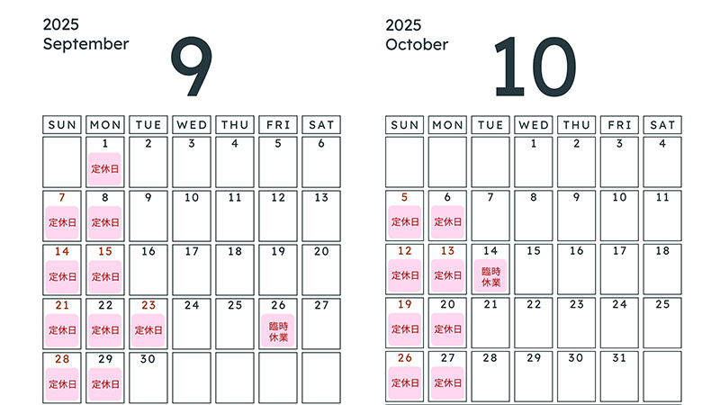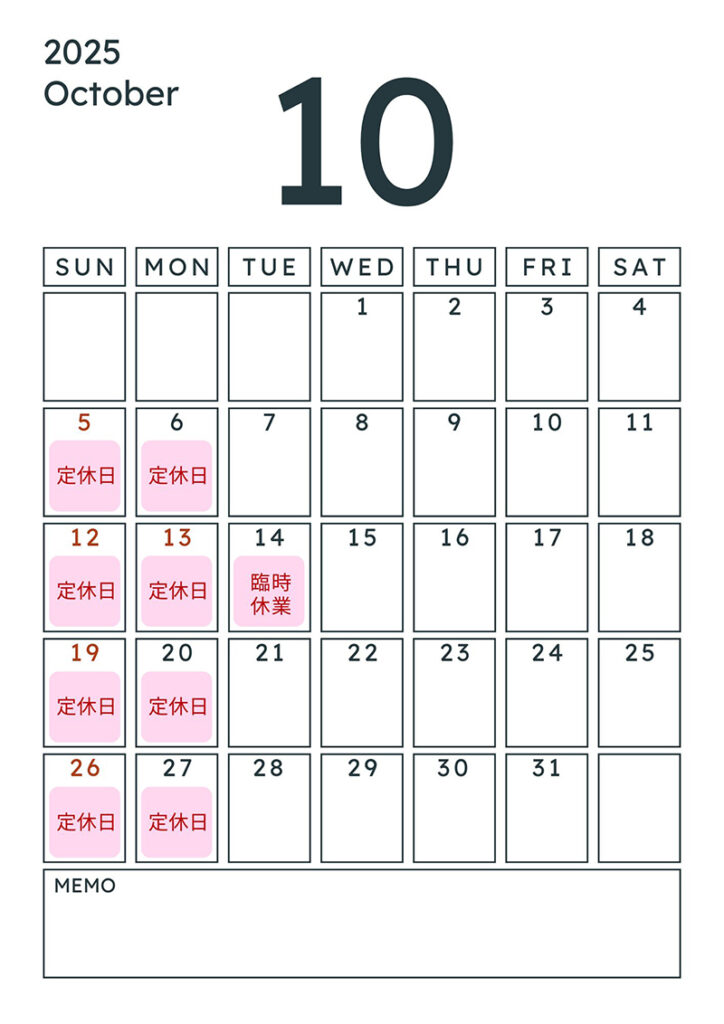 さらに10月14日(火)は臨時休業とさせていただきます。ご来店の際は、下記の日程をご確認ください。
