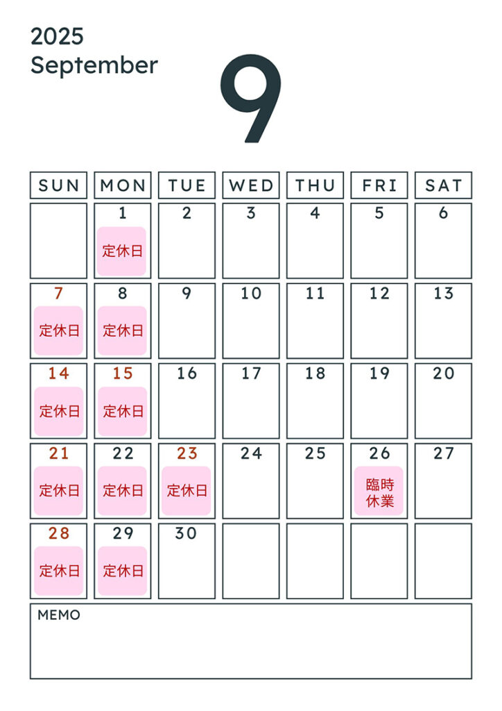 当店は毎週「日曜・月曜」および「祝日」がお休みです。
