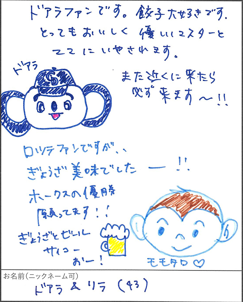 ドアラ&リラ(43)さまから、かわいいイラスト入りのメッセージをいただきました。それぞれの野球愛と餃子への感想をいただきましたのでご紹介します。